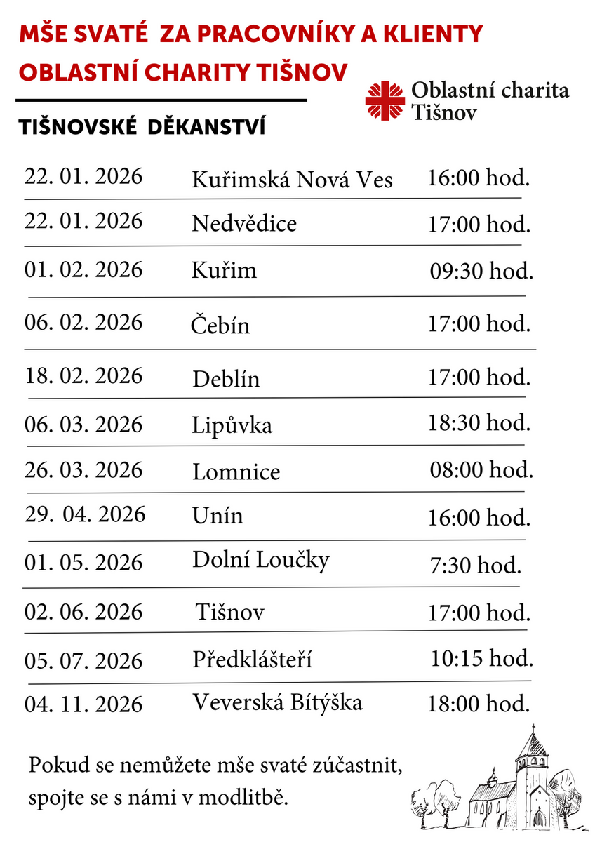I v letošním roce budou v rámci tišnovského děkanství ve farnostech slouženy mše svaté za naše klienty a pacienty, za pracovníky Charity – i za celé naše charitní dílo.